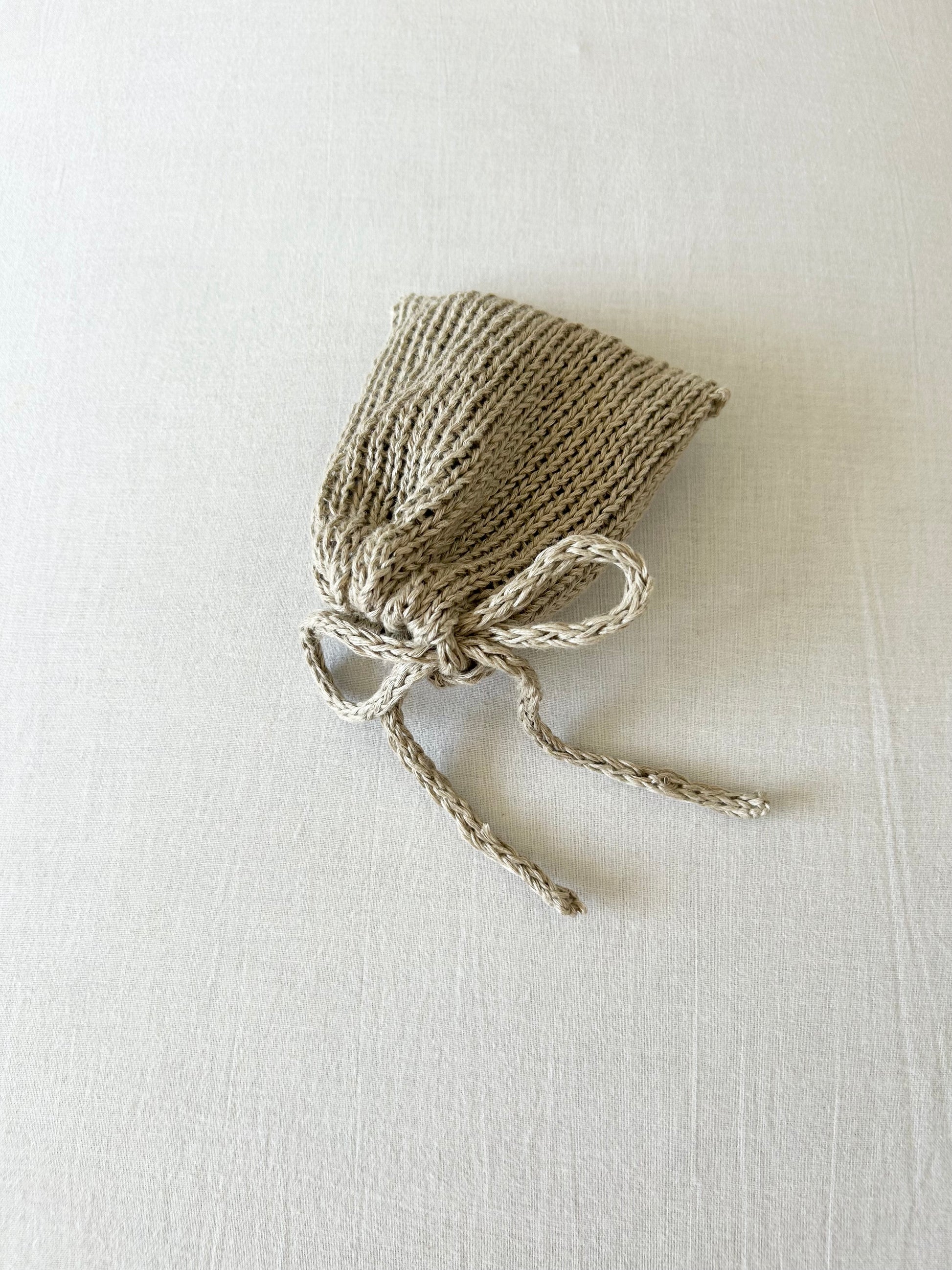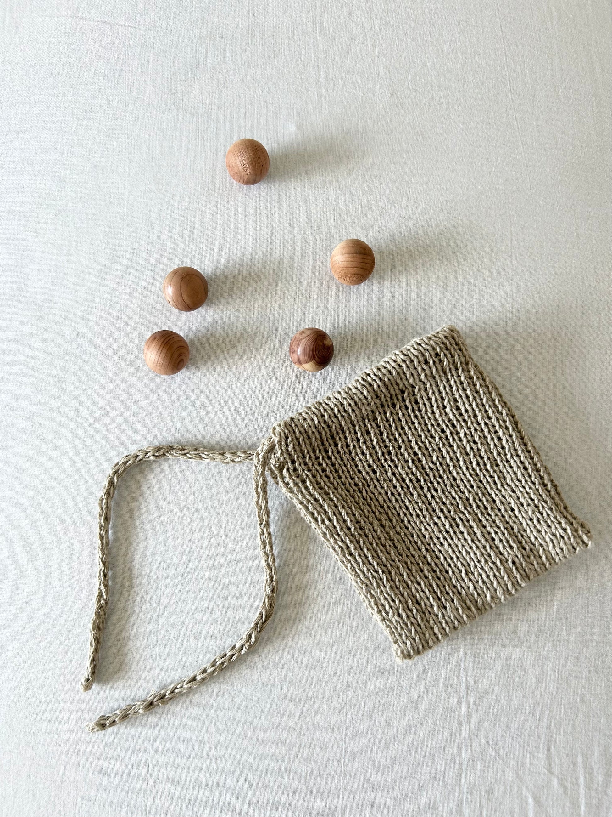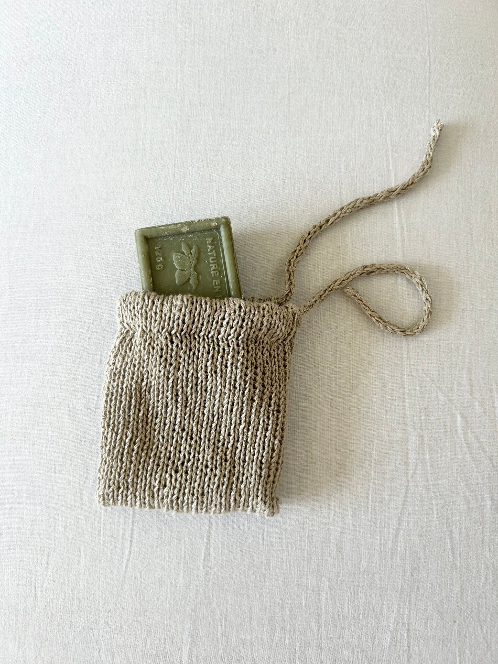 Der Seifenbeutel wird von unten nach oben in einem Stück gestrickt. Er wird in Runden gestrickt und anschließend hin und her gestrickt, sodass eine offene Faltkante entsteht, die als Kordelzug dient.
