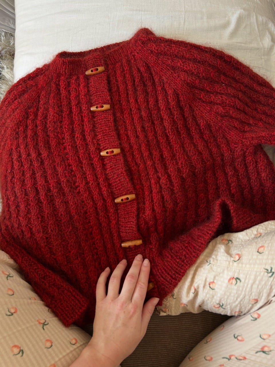 Bille Jacket is slightly oversized and has a single cable pattern throughout the jacket. The jacket is knitted top down and shaped using raglan increases. The body and sleeve stitches are then divided and knitted separately and finished with a rib edge and a button band.