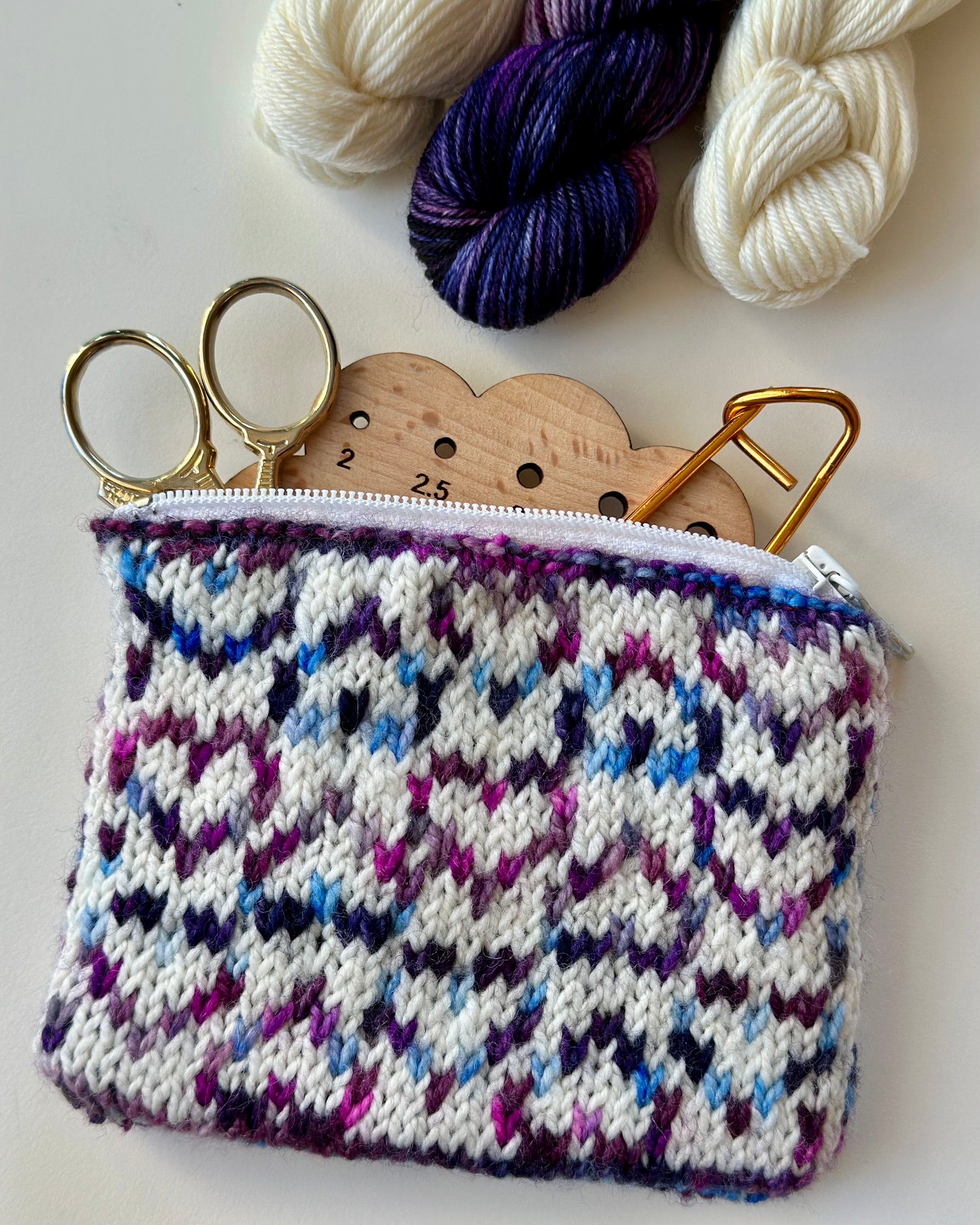 Cupid Clutch (Cupid Pung) er en pung med et Valentins inspireret hjertemønster, som er perfekt til hobbyting eller makeup. Pungen strikkes rundt med mønster på ydersiden og én farve på indersiden, som udgør foeret. Pungen på billedet er strikket i str. 1 i Merino Sock fra Sabinas Farver i Terrific Twos og ufarvet.